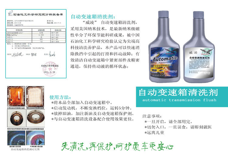 “威凌” 自動變速箱清洗劑,是美國納米技術(shù),最新納米級磁性單分子環(huán)保節(jié)能科研成果,被中國石油化工科學(xué)研究檢驗認(rèn)定為尖端高科技清洗養(yǎng)護(hù)品,本產(chǎn)品可以快速消除換擋中引起的打滑和抖動故障;有效清潔自動變速箱中緊密部件及精密通道,保持傳動液的循環(huán)狀態(tài);